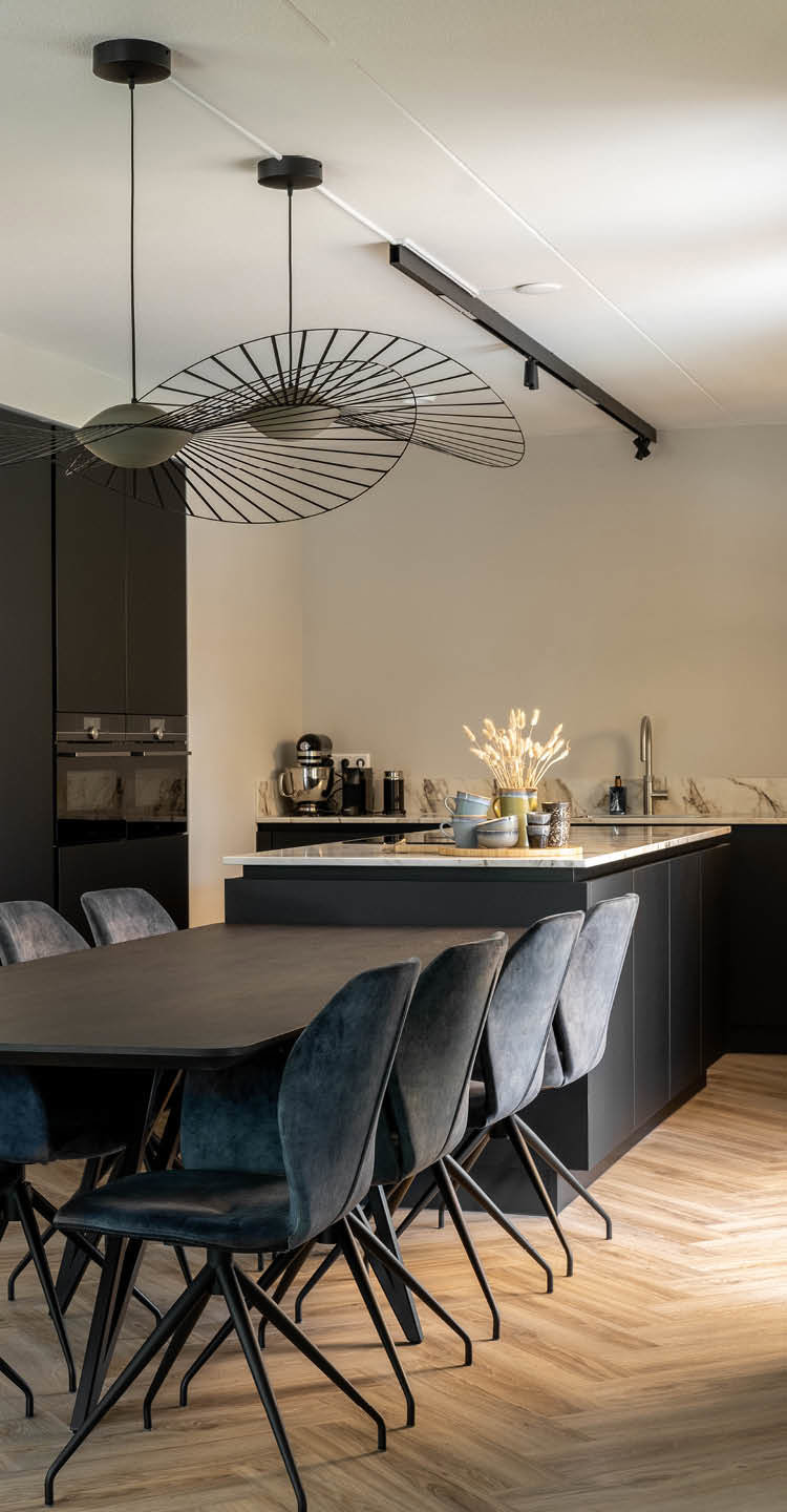 A modern kitchen deserves a perfect table. That would in this case be our black dining table Pomm. It allows space for eight stylish Mood dining room chairs. Not too hard with a 260 x 100 cm table to pair it with. This room is filled with a calm and a feeling of trust, all due to the blue shades added to a pallet of black and grey.