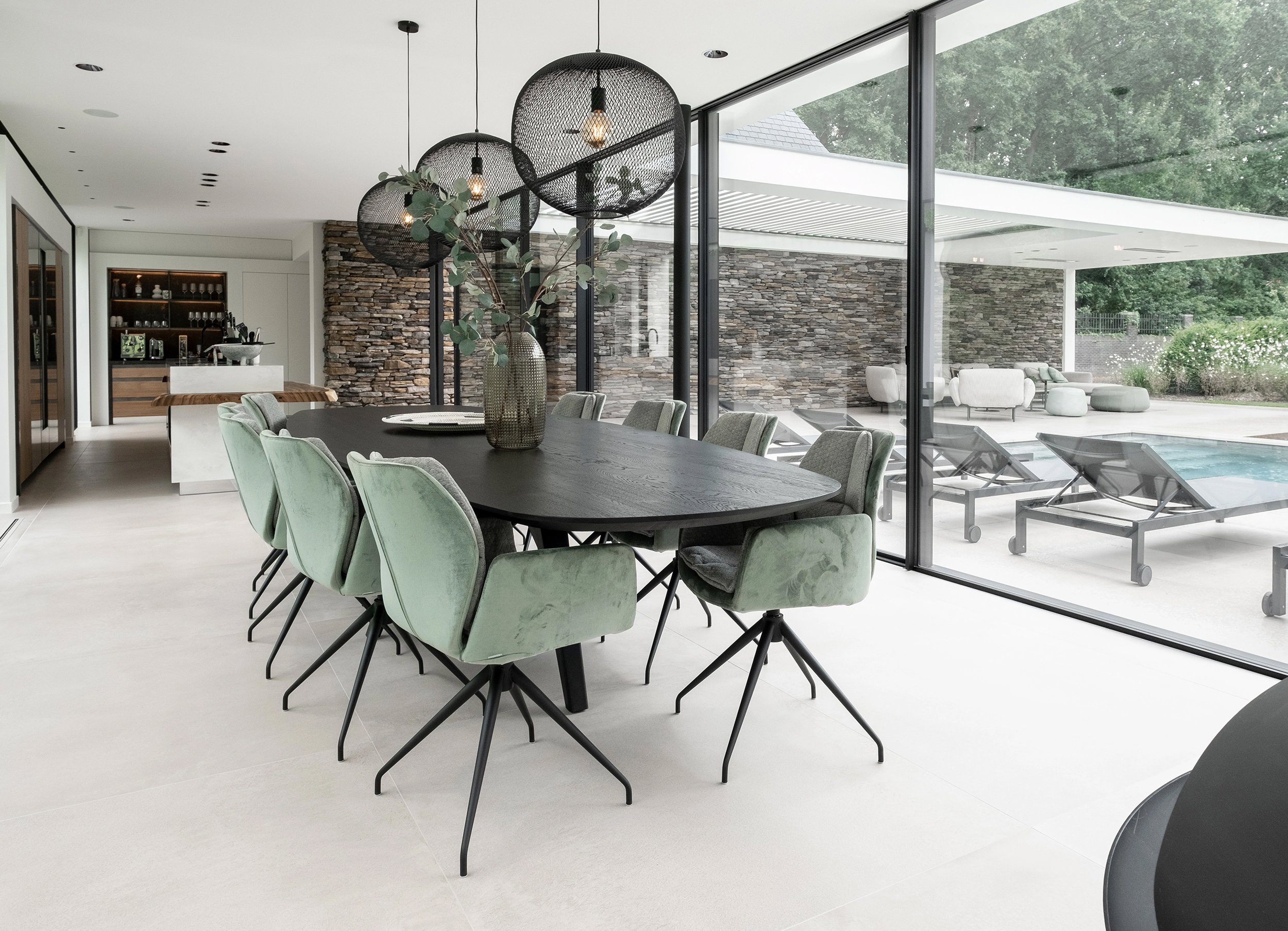 The black table, in the color 'deep black', almost stands out against the light gray floor. But due to the soft and light color(s) of the dining room chairs, the hard contrast between table and floor is brought back into balance. You can see that this has been well thought out!