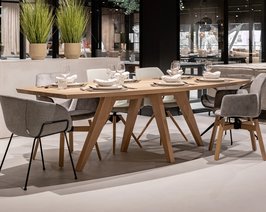 Round and oval dining tables are known for their old-fashioned conviviality. Due to the lack of straight lines, no one sits exactly side by side. That makes it easier to see each other and enjoy a good conversation. Delicious food, an evening drink or a game: an oval dining table makes it even more sociable.