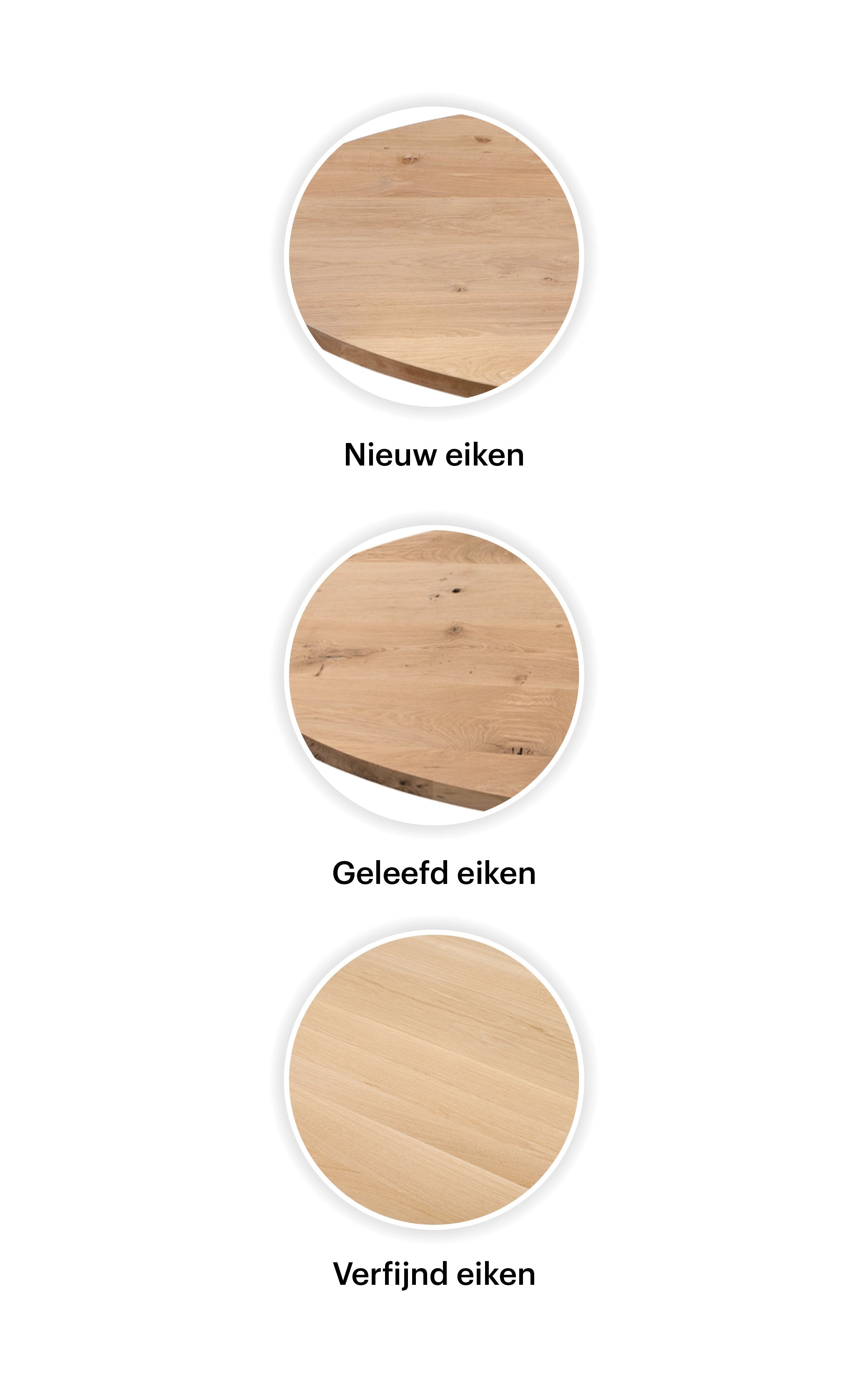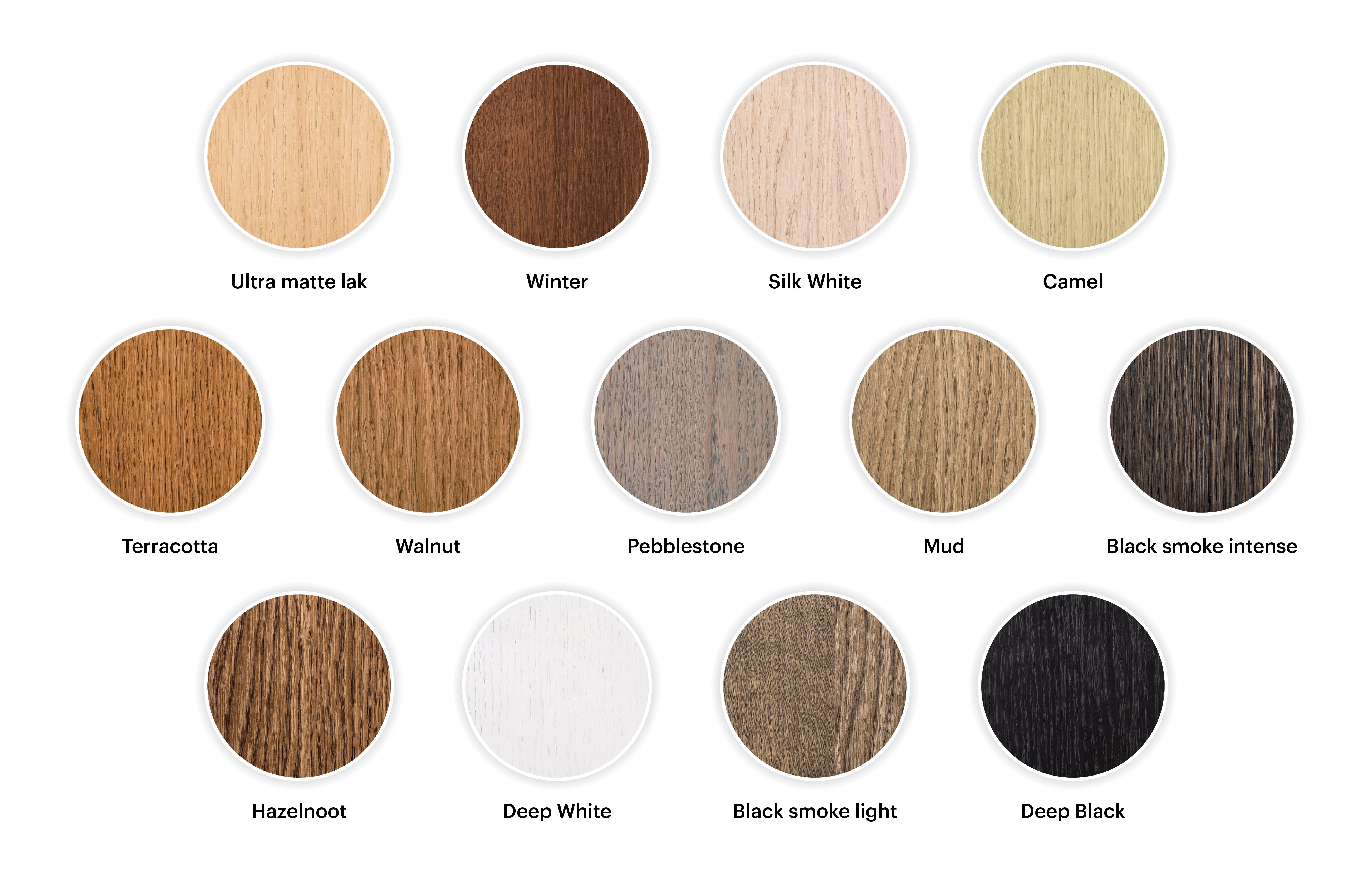 Hierboven zie je een overzicht van de kleuren die wij aanbieden voor onze eiken meubels. Elke behandeling is op basis van een speciale olie of lak voor meubels die intensief gebruikt worden. Er zullen geen kringen en vlekken ontstaan en je kunt gewoon een kopje warme thee zonder viltje op de tafel zetten, er ontstaan geen (witte) kringen. Pas wel op met bijvoorbeeld rode wijn, laat dit niet de hele nacht op tafel liggen, op den duur trekt de vlek dan toch in het hout. Door het aanbrengen van de ultra matte lak behoudt het hout de onbehandelde look. Deze behandeling zorgt ervoor dat jouw tafel heel erg goed beschermd is.