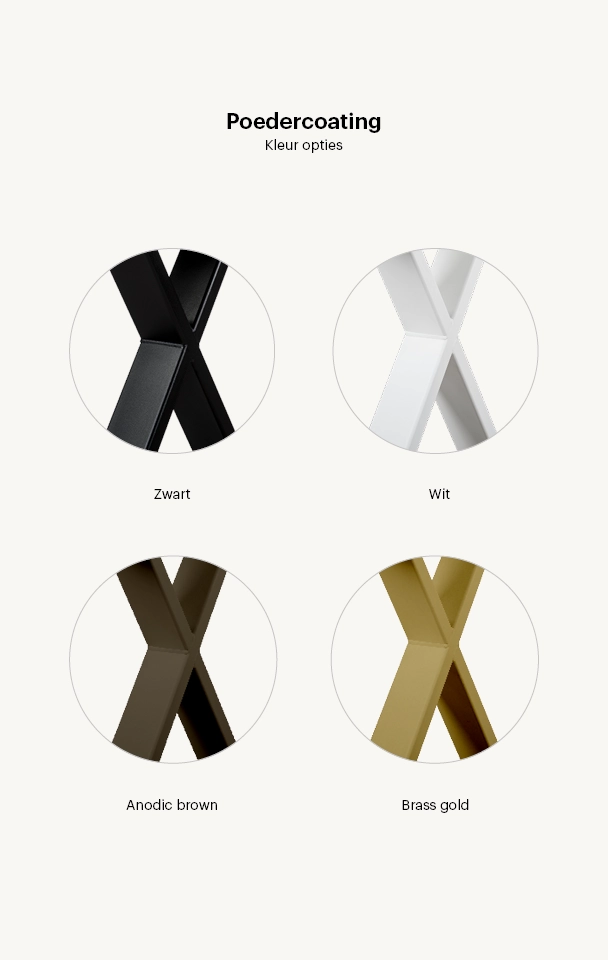 Daarnaast kun je kiezen voor een zwarte, witte of een andere kleur poedercoating. Hiermee krijgt het onderstel een strakke, moderne look waarbij de kleur egaal is aangebracht.