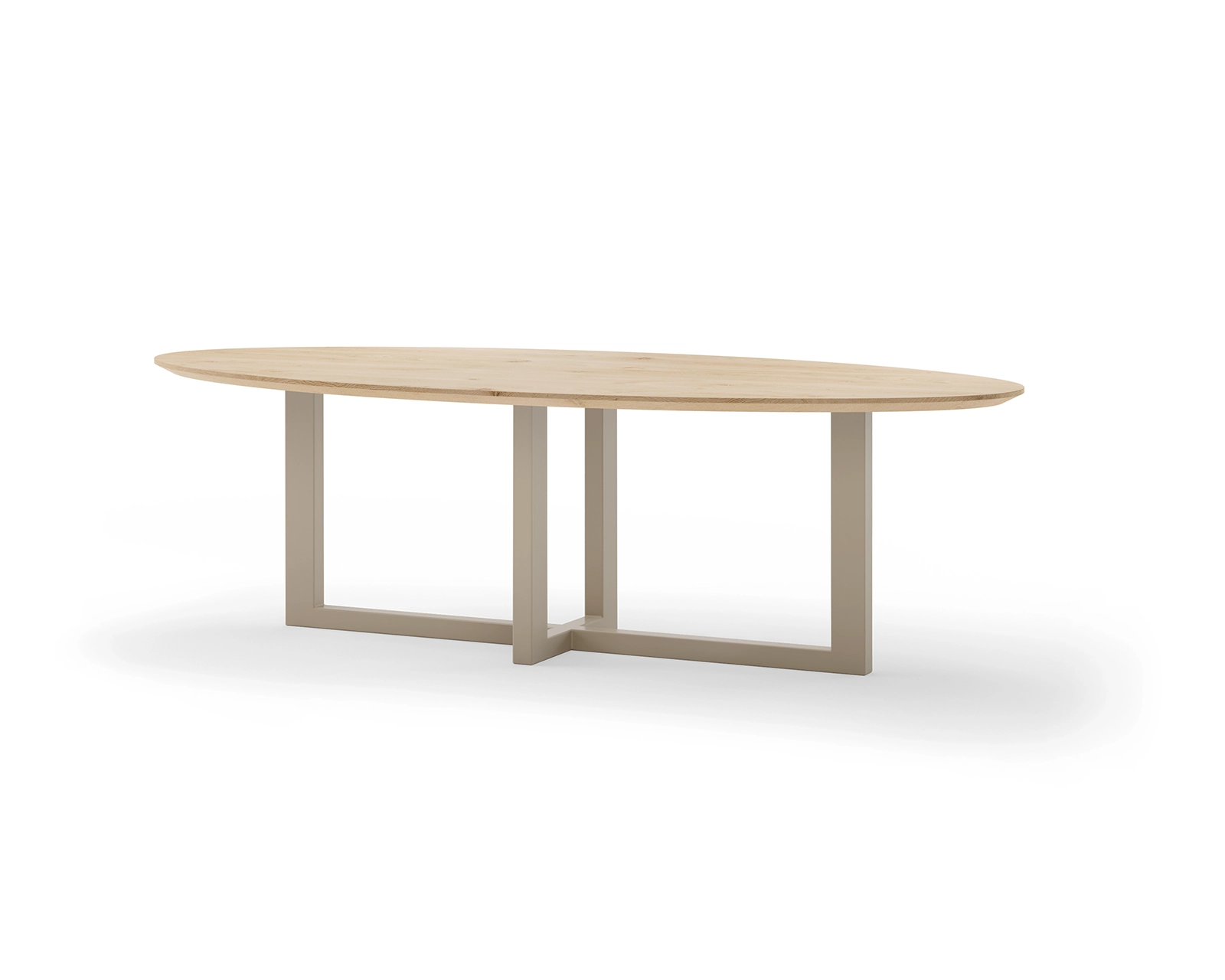 Ovale eiken tafel op maat, diverse kleuren, stalen Louise onderstel.